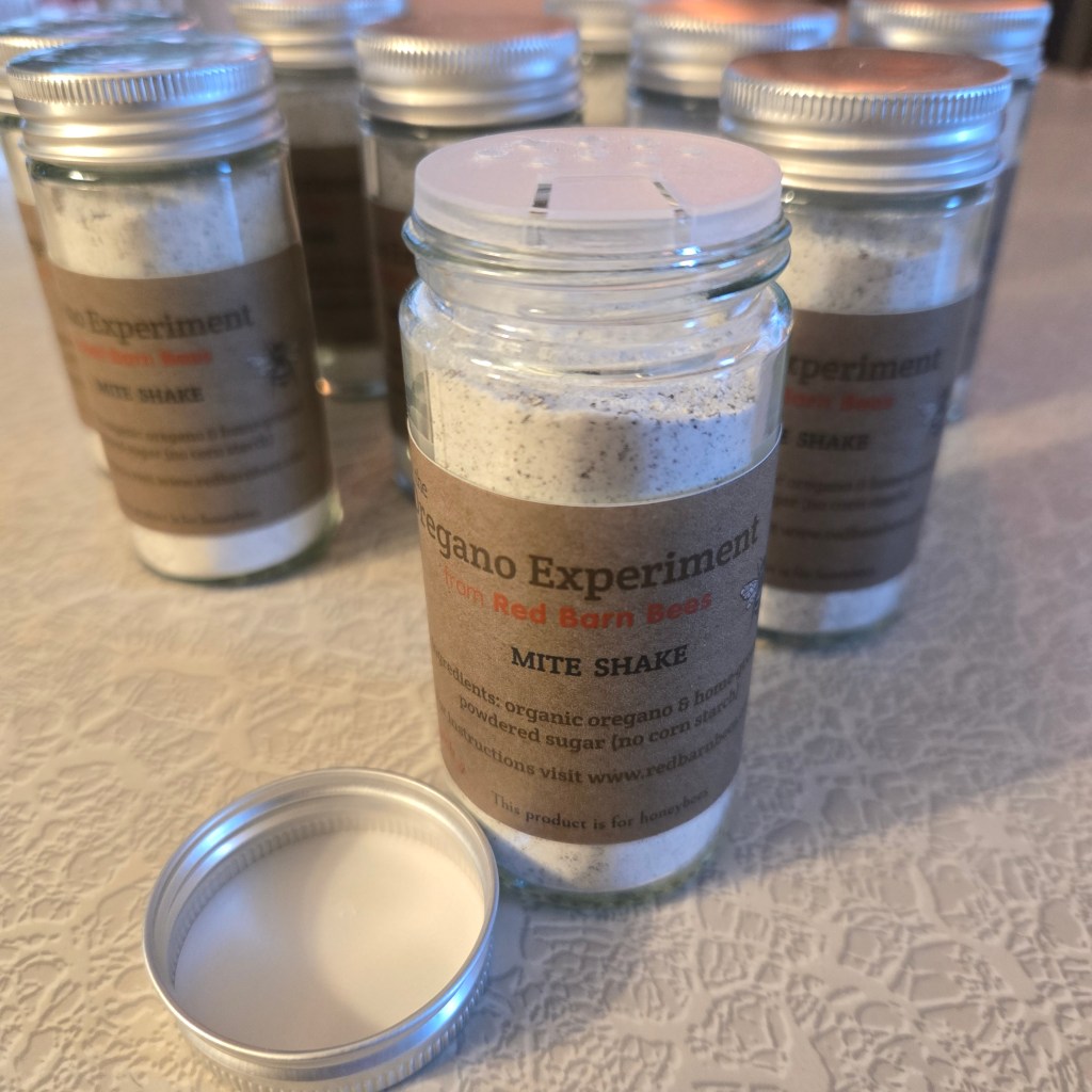 Description: A tool that encourages the colony to begin social grooming. As the bees move, they spread the oregano particles throughout the hive & dislodge mites. SMB are attracted to the sugar & digest the oregano, disrupting their reproductive cycle. Shaker contains approximately ten applications.